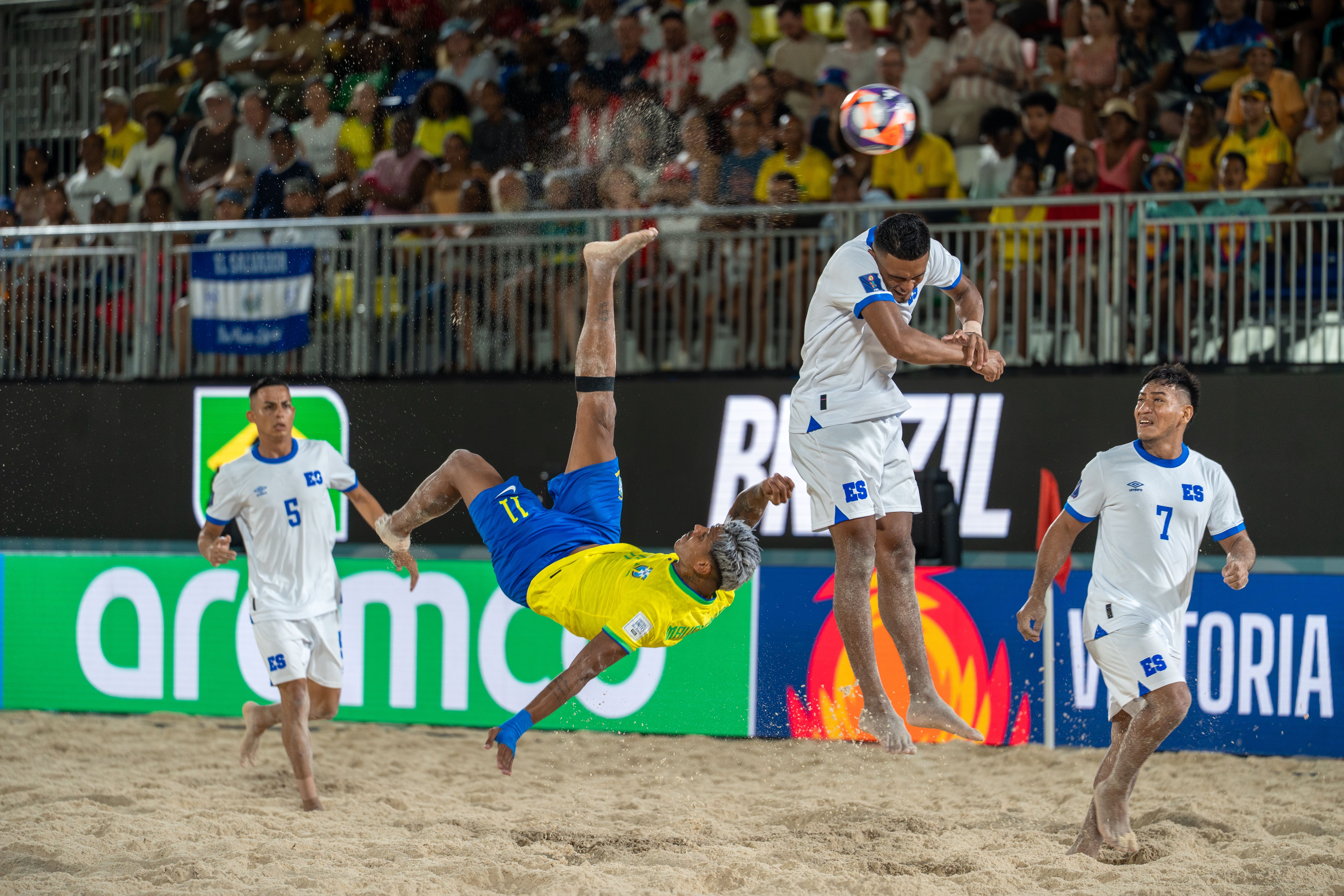 Mauricinho tenta gol de bicicleta na vitória do Brasil sobre El Salvador, na estreia da Copa do Mundo de Beach Soccer – Créditos: Marlon Panagary/CBF