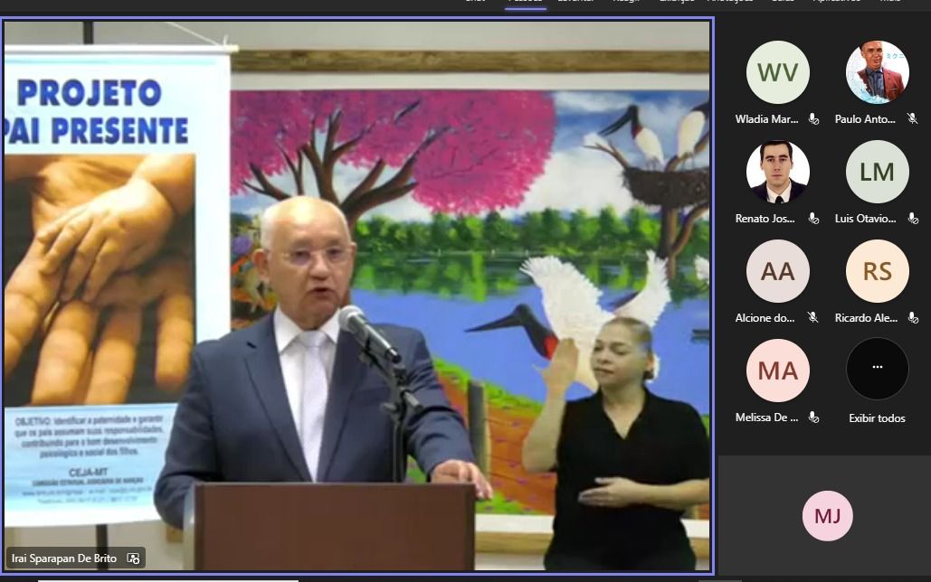 #Paratodosverem. Esta matéria possui recursos de texto alternativo para inclusão das pessoas com deficiência visual. Descrição da imagem: Imagem 1 – Print de tela que mostra a transmissão da cerimônia pelo Teams. Imagem 2 – Duas filhas e o filho abraçam o pai após reconhecimento da paternidade. Imagem 3 – Desembargador preside a cerimônia que oficializa o Mutirão em Mato Grosso. Imagem 4 – juiz coordenador do Cejusc de Cáceres fala sobre o Pai Presente.