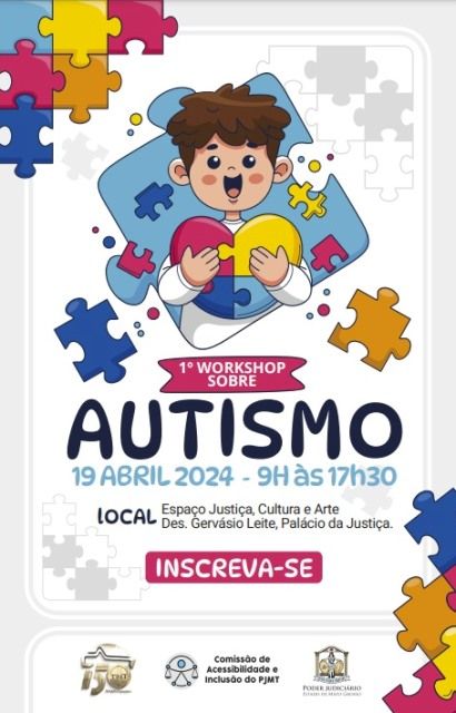 Esta matéria possui recursos de texto alternativo para promover a inclusão das pessoas com deficiência visual. Descrição de imagem: arte gráfica digital vertical com o desenho de um menino segurando um objeto em formato de coração feito com peças encaixadas, nas cores azul, rosa e amarelo. Ao redor do desenho do menino há desenhos de peças de quebra-cabeça nas mesmas cores, representando o símbolo do autismo. Ao centro está escrito 1º workshop sobre autismo, 19 abril 2024 – 9h às 17h30 local Espaço Justiça, Cultura e Arte Des. Gervásio Leite, Palácio da Justiça. Inscreva-se. Assinam a peça os logos de 150 anos do Tribunal de Justiça, Comissão de Acessibilidade e Inclusão do PJMT e Poder Judiciário de Mato Grosso.