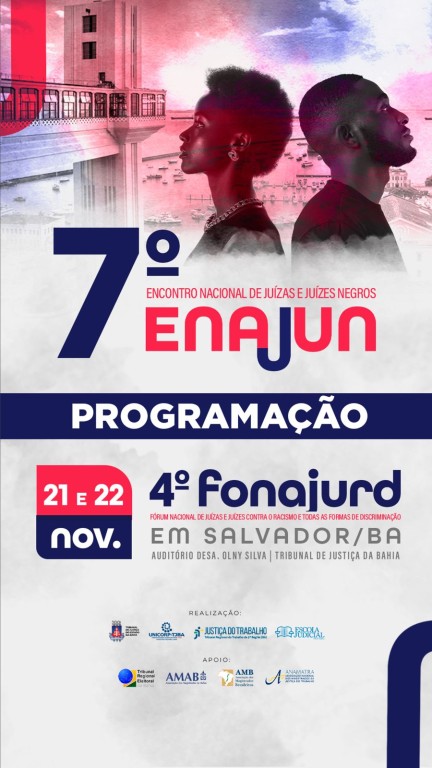 #Paratodosverem – Esta matéria possui recursos de texto alternativo para promover a inclusão das pessoas com deficiência visual. Foto 1: Cartaz com a imagem do elevador Lacerda, em Salvador, no canto superior esquerdo e uma mulher e um homem negro de costas um para o outro no canto superior direito. Em tons de vermelho e azul, os dizeres 7º Encontro Nacional de Juízas e Juízes Negros (ENAJUN).