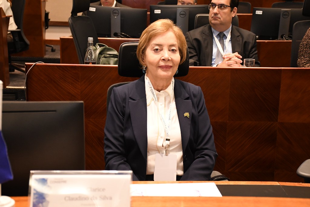 #Paratodosverem. Esta matéria possui recursos de texto alternativo para promover a inclusão das pessoas com deficiência visual. Foto 1: Desembargadora Clarice Claudino sentada, posando e sorrindo para a foto. Ela é uma senhora branca, de cabelos loiros, curtos e lisos. Está usando camisa branca e terno preto com broche d Consepre, em formato do mapa do Brasil com as cores verde e amarelo e as estrelas que representam os 26 estados e o Distrito Federal. A frente dela, sobre a mesa, uma plaquinha com suas credenciais. Ao fundo, se vê outros participantes assistindo à conferência. Foto 2: Membros do Consepre, entre eles a desembargadora Clarice Claudino, posam lado a lado para a foto. Eles estão no Plenário do Tribunal de Justiça do Rio Grande do Sul.