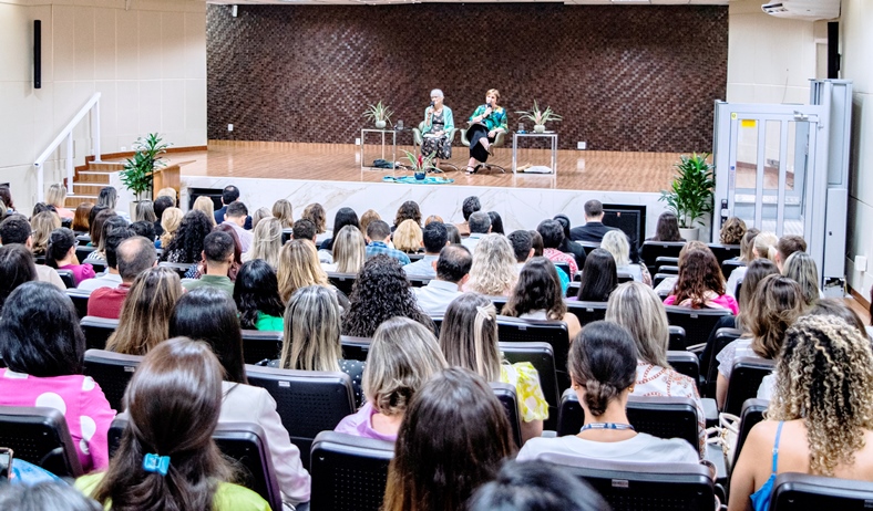 #Paratodosverem – Esta matéria possui recursos de texto alternativo para promover a inclusão das pessoas com deficiência visual. Foto 1: imagem geral do evento. No primeiro plano os participantes. Ao fundo a palestrante sentado e ao lado dela a interprete.Foto 2: Presidente do TJMT, desembargadora Clarice Claudino da Silva fala ao microfone. Ela é uma senhora branca, de cabelos lisos, curtos e castanho médio, olhos claros, usando camisa com estampa de onça, colar de correntes douradas.. Foto 3: juiz-auxiliar da presidência fala ao microfe. A fundo aparece a imagem da palestrante e da interprete. Foto 4: Kay Pranis e a tradutora de inglês, Fátima Price, sentadas em poltronas no palco do auditório Gervásio Leite. Ambas são senhoras brancas. Kay com cabelos brancos, lisos e presos. E a intérprete com cabelo castanho médio, liso e curto. Kay usa um vestido longo preto com estampa floral, cardigan verde claro e sapatilha preta. A intérprete usa calça preta, camisa com estampa de folhas e flores nas corres verde e amarelo e fundo preto e sandália Anabela preta. Ao lado delas, há pequenas mesas com vasos de plantas sobre elas. Foto 5: participantes estão em pé realizando uma dinamica em grupo.
