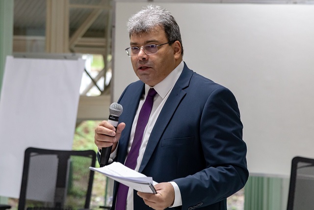 #Paratodosverem. Esta matéria possui recursos de texto alternativo para promover a inclusão das pessoas com deficiência visual. Primeira imagem: Juiz Geraldo Fidelis une as mãos em pose de contemplação. Ele usa óculos de grau e veste terno da cor cinza médio.