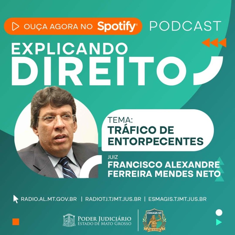 #ParaTodosVerem – Esta matéria possui recursos de texto alternativo para promover a inclusão das pessoas com deficiência visual. Descrição: peça publicitária retangular e colorida. Na lateral esquerda, o texto ‘Ouça agora no Spotify!’, seguido da palavra Podcast. No centro, o nome do programa Explicando Direito, com foto e nome do convidado, juiz Francisco Alexandre Ferreira Mendes Neto, bem como o tema Tráfico de entorpecentes. Na parte inferior, os endereços eletrônicos da Rádio Assembleia, Rádio TJ e Escola da Magistratura. Assina a peça o logo do Poder Judiciário de Mato Grosso e da Esmagis-MT.