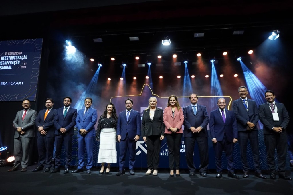 Paratodosverem. Esta matéria possui recursos de texto alternativo para promover a inclusão das pessoas com deficiência visual. Descrição de imagem, foto 1: Doze pessoas em pé, perfiladas, em cima do palco onde foi realizado o VI Congresso de Reestruturação e Recuperação Empresarial. São nove homens e três mulheres. Todos olham para a câmera e sorriem. Foto 02: Quatro pessoas em pé, perfiladas, sorrindo para a câmera, sendo dois homens e duas mulheres. Um dos homens é o ministro Luis Felipe Salomão e ele está segurando um quadro de homenagem pela participação no congresso. Ele usa óculos, usa terno azul escuro, gravata azul, camisa branca. Ao seu lado esquerdo há um homem de terno azul médio, gravata azul e camisa branca. Ao lado direito do ministro está a desembargadora Maria Erotides, ela está de cabelos presos, para trás, com terno perto e camisa branca. Ao lado da desembargadora está a presidente da OAB-MT Gisela Cardoso, ela está com cabelos soltos, ondulados, blazer rosa e calça preta.