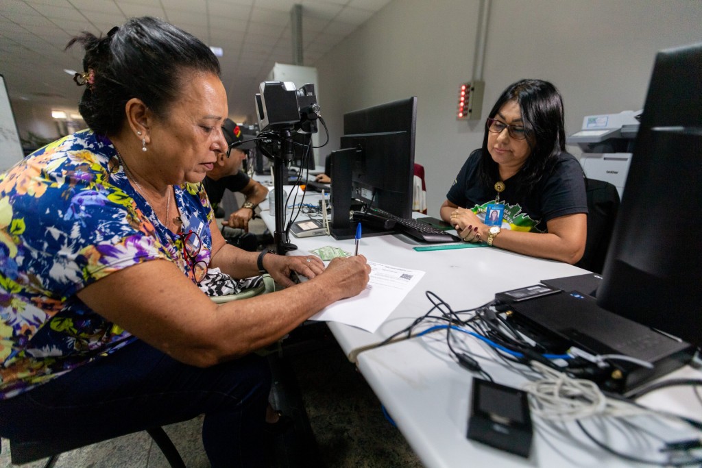 #ParaTodosVerem – Esta matéria possui recursos de texto alternativo para promover a inclusão das pessoas com deficiência visual. Foto 01: Eleitora assina documento enquanto atendente confere assinatura. A eleitora é uma mulher de pele preta, tem cabelos lisos e presos, usa uma camiseta azul com flores azuis e verdes. A atendente é uma mulher de pele preta, tem cabelos lisos e soltos, usa óculos e relógio dourado no pulso. Elas estão uma em frente a outra, separadas por uma mesa de atendimento e um computador. Foto 02: Desembargadora Maria Aparecida Ribeiro posa ao lado de servidora que acabou de regularizar o título. A desembargadora é uma mulher de pele clara, cabelos grisalhos, usa óculos grandes, colar e brinco dourados, blazer preto e camiseta vermelha. A servidora é uma mulher de pele parda, cabelos curtos e iluminados, usa óculos, cardigã listrado e blusa marrom. Ambas sorriem para foto. Foto 03: Senhor Belchior fala aos jornalistas. Ele é um homem de pele parda, cabelos brancos, usa boné e camiseta.