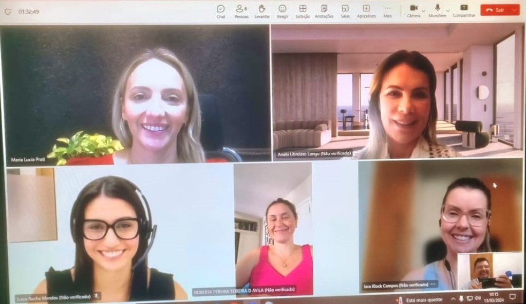 #Paratodosverem. Esta matéria possui recursos de texto alternativo para promover a inclusão das pessoas com deficiência visual. Primeira imagem: No canto esquerdo superior, a juíza da Comarca de Campo Verde, Maria Lúcia Prati, e a sua direita, a promotora de Justiça de Santa Catarina, Analú Librelato. Ainda na mesma imagem, no canto direito inferior, a promotora de Justiça da Comarca de Santa Rosa do Sul, Iara Klock Campos, membro do Núcleo Permanente de Incentivo à Autocomposição. Ao centro da imagem, as servidoras Roberta Pereira que veste blusa rosa e Luiza Rocha de blusa preta e fone de ouvido.