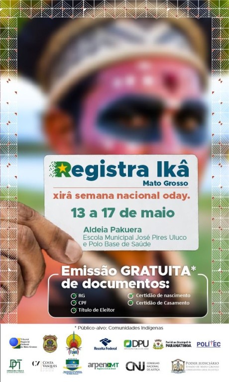 O material gráfico foi aprovada durante a terceira reunião de alinhamento do grupo e traz os dizeres: “Registra Ikâ Mato Grosso – Xirâ Semana Nacional Oday”. “Essa adaptação reflete o compromisso das instituições envolvidas em garantir que a mensagem da campanha alcance todos os segmentos da sociedade, incluindo aqueles que serão atendidos e têm suas próprias línguas e culturas. Ao adotar essa abordagem inclusiva, a CGJ-MT e seus parceiros reafirmam o compromisso com a promoção da identificação civil da parcela da população socialmente vulnerável para acesso à documentação básica”, argumentou o corregedor-geral da Justiça, desembargador Juvenal Pereira da Silva.