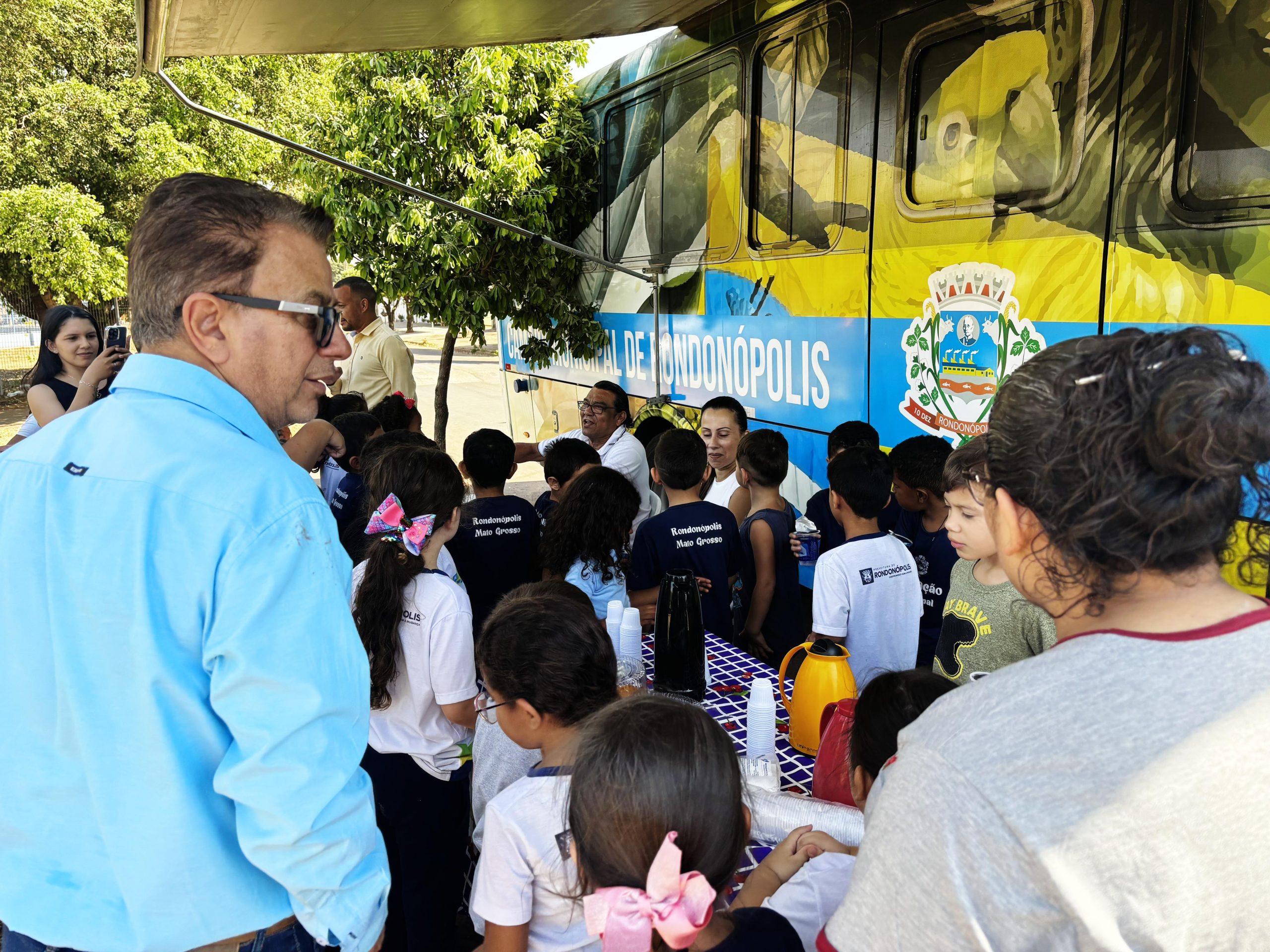 Durante a atividade, alunos da CMEI Joana Maria dos Anjos Meireles participaram de uma visita para conhecer os trabalhos da ação itinerante e o ônibus da Câmara, que esteve estacionado no local.