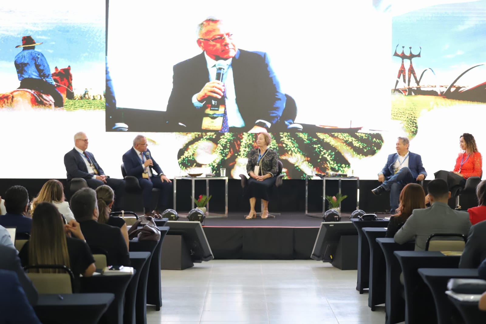 Primeira imagem: fotografia colorida mostrando os palestrantes no palco.